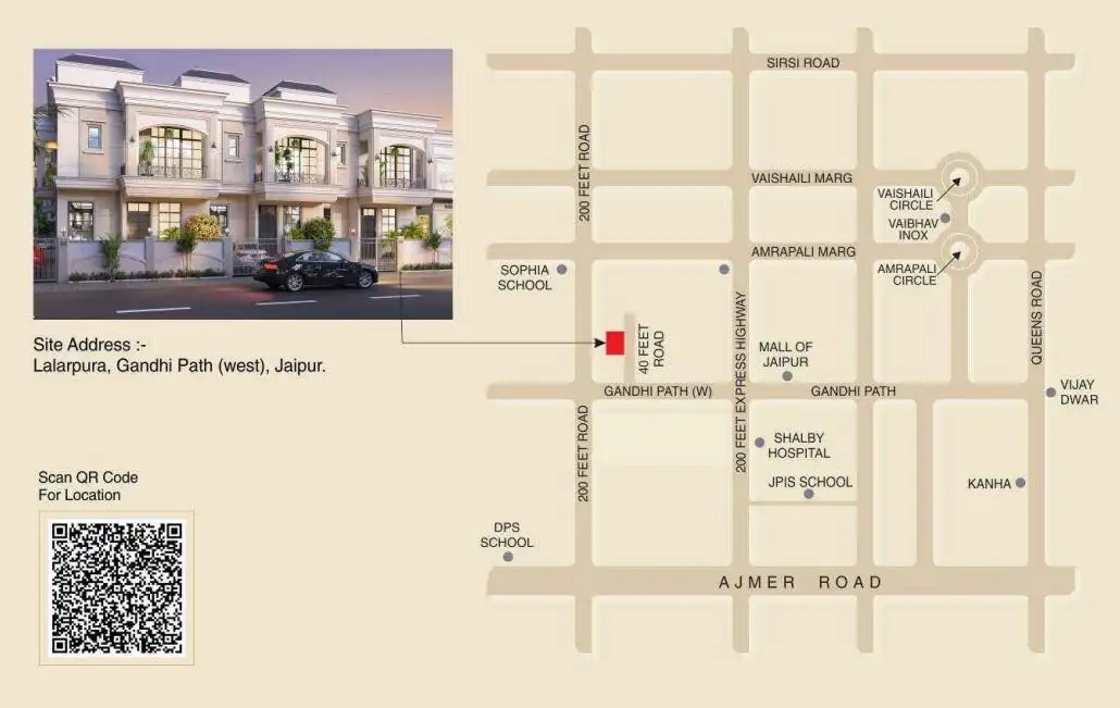 Strategically located on Gandhi Path, the project enjoys excellent connectivity to key landmarks such as Sophia School, INOX Elements Mall, and Chitrakoot Stadium, along with easy access to other important areas of the city.
