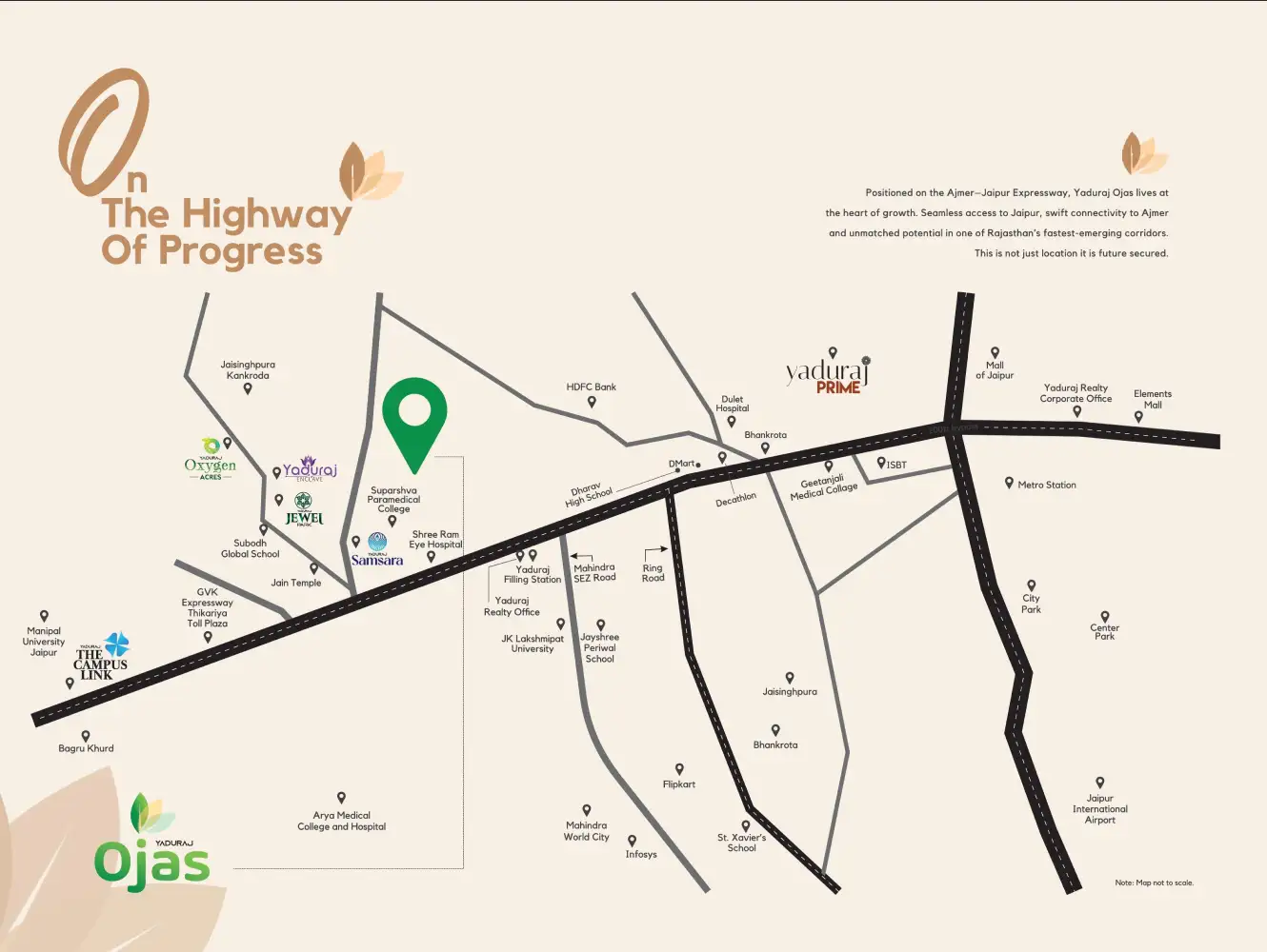 With a total of 160 well-organized plots, the project maintains a balanced and spacious residential environment. Its prime location on Ajmer Road ensures excellent connectivity to schools, hospitals, commercial centers, and major transport routes. Yaduraj Ojas is an ideal option for both homebuyers and investors, offering a combination of location advantage, planned infrastructure, and long-term value.